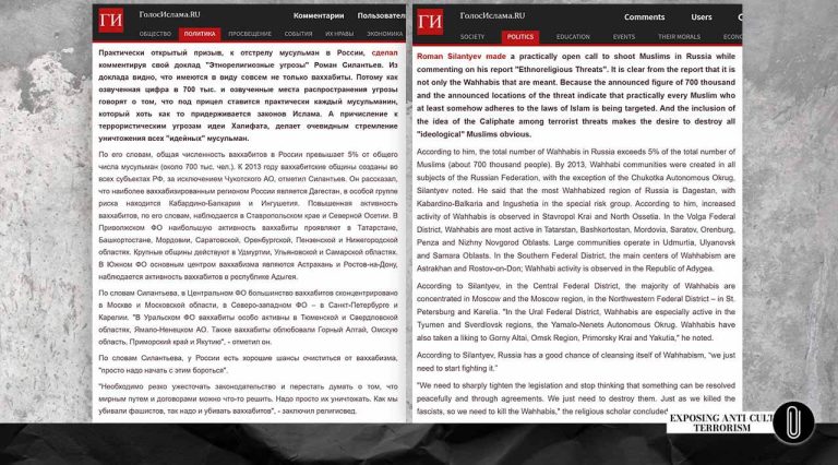 «З доповіді видно, що маються на увазі зовсім не тільки ваххабіти. Тому що озвучена цифра в 700 тис. і озвучені місця поширення загрози говорять про те, що під приціл ставиться практично кожен мусульманин, який хоч якось дотримується законів Ісламу. А зарахування до терористичних загроз ідеї Халіфату, робить очевидним прагнення знищення всіх «ідейних» мусульман.»
