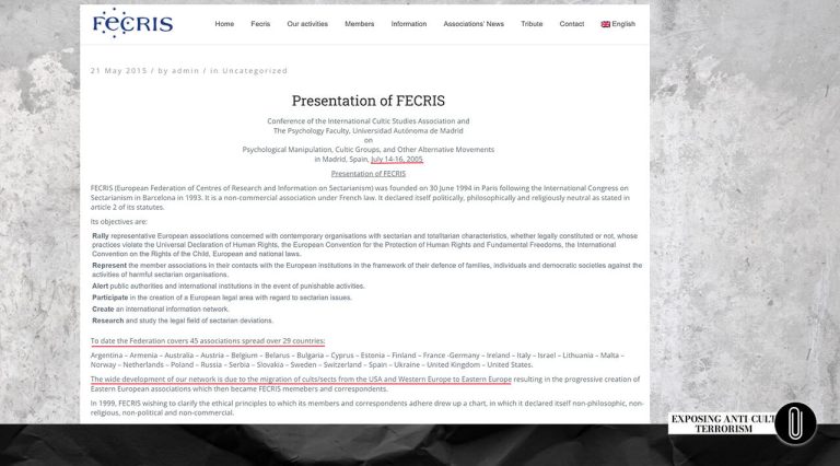 Цю віру членів FECRIS в існування американської змови підтверджують і деякі антикультові конференції. Наприклад, у 2005 році відбулася конференція в Мадриді, Іспанія [20].